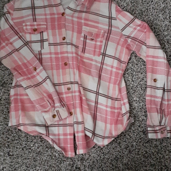 Pink, button up, can roll up sleeves