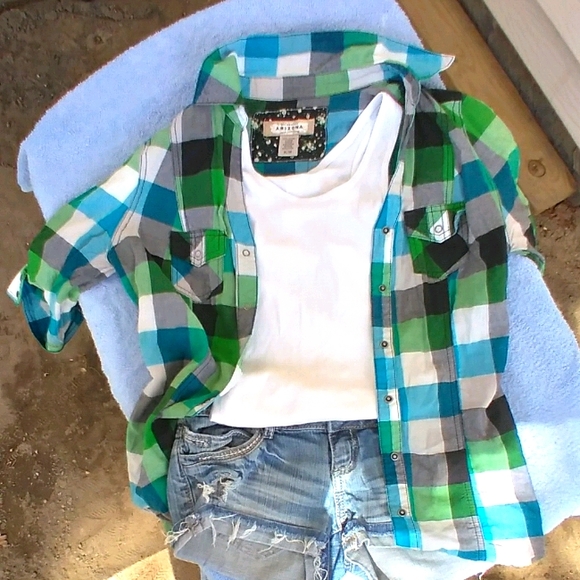 Green, blue, and white button up flannel
