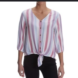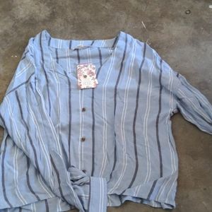Pink rose branded, new, flannel, stripes with white and dark blue, button down, tied in the front, button on each arm