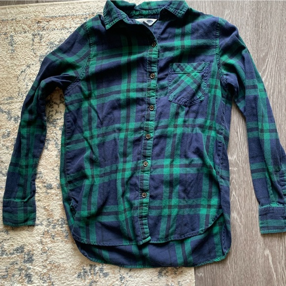 Women’s navy and green flannel button down. Size extra small. In good used condition.