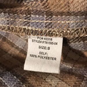Earth tones and baby blue and cream flannel. A little over sized. Nice to layer with or throw on over something. 100% polyester. Like new worn once