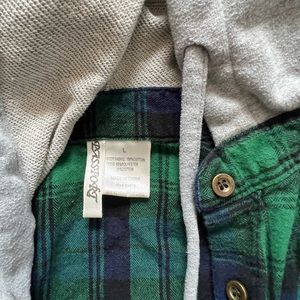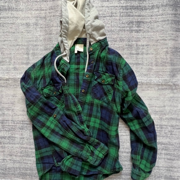 Comfy button up flannel with a hood, thick material.