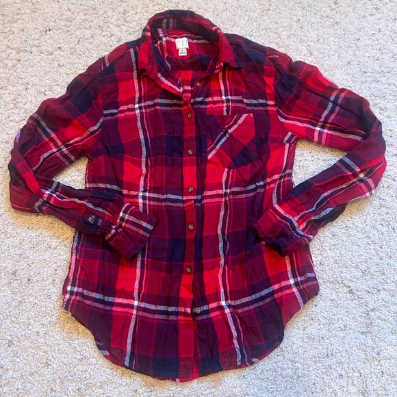 Lightweight flannel. Beautiful coloring. Pocket on left chest. Button closure. Smoke/pet free home.