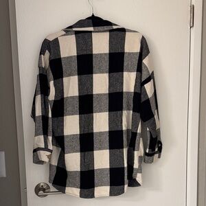 Stylish black and white plaid button-up shirt. Features a classic collar and front pocket.