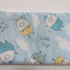 Soft pale blue flannel with pigs of different colors. The back is blue with yellow moon and stars.