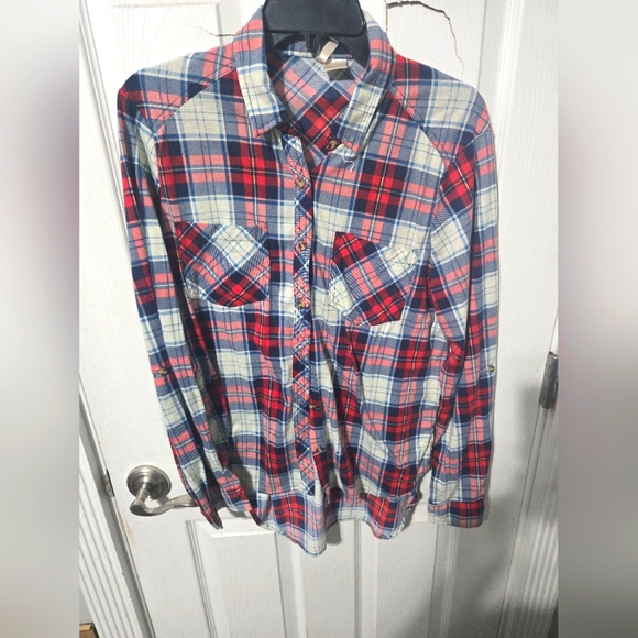 This is a red, white, and blue plaid flannel shirt. It has a collar, buttons down the front, and two chest pockets. GUC. Size Large.