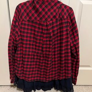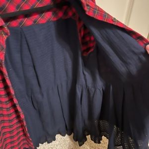 BDG brand, purchased from Urban Outfitters. Red button-down flannel with navy blue ruffle at bottom hem.