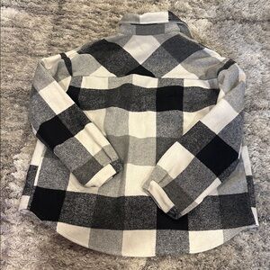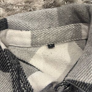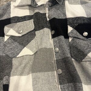 Stylish plaid button-up jacket with chest pockets. Features a classic black, white, and gray checkered pattern.