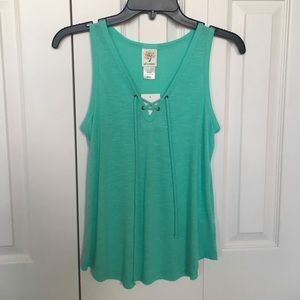 •Flannel has black, pink, and teal stripes. Tank top is all teal