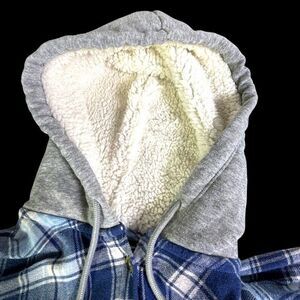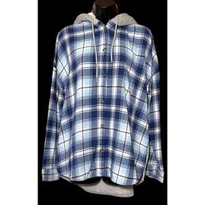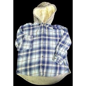 Flannel Faux Fur Hoodie Women Blue Plaid Button Up Long Sleeve Size XL (15-17)