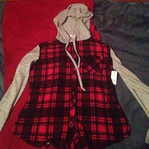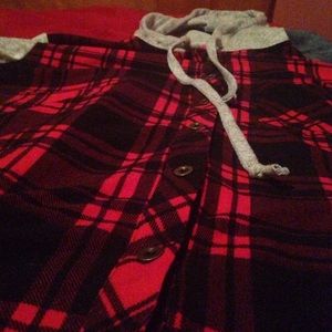 Soft, cute button-down red flannel hoodie with grey sleeves and hood