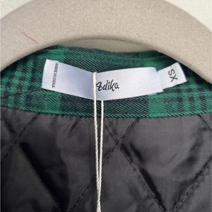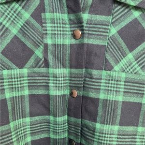Green and black thick flannel jacket. Super durable and so cute. Size XS but could fit more like a small for women. Super comfortable and warm.