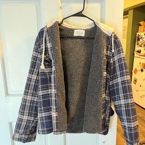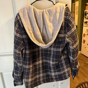 Flannel jacket w/ sweatshirt hood and draw stings. Navy & Gray. Size S. More like a S/M.