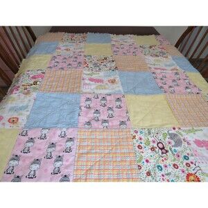 The front is ragged and the back has the same prints but not ragged and looks like a quilt. Each square is sewn with an X. This quilt is clipped with 1 inch seams