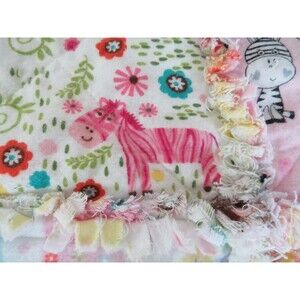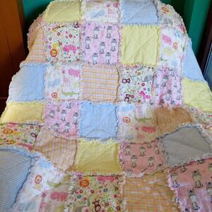 This rag quilt is made of soft flannel of 6 different flannel prints of jungle animals, zebras, stripes, yellow and blue fabric on the front and the back.