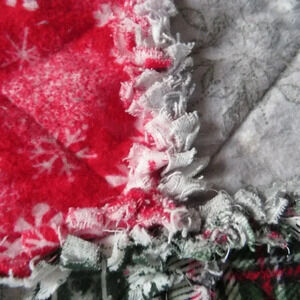 The front is ragged and the back has the same prints but not ragged and looks like a quilt. Each square is sewn with an X. This quilt is clipped with 1 inch seams