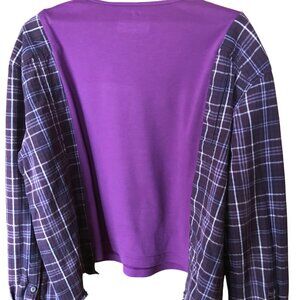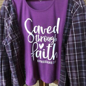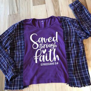 Upcycled flannel tee size L-XL, reworked oversized t-shirt with "Saved through Faith" graphic and fringy hem. This is a pretty pullover sweater remake with a Christian graphic on beautiful purples!