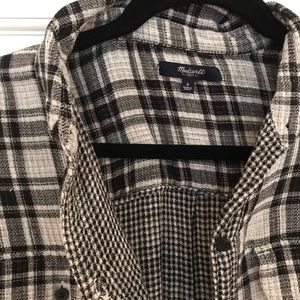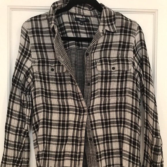 Gray tones/black plaid flannel. Longer than a normal top. Different plaid print on the inside