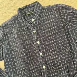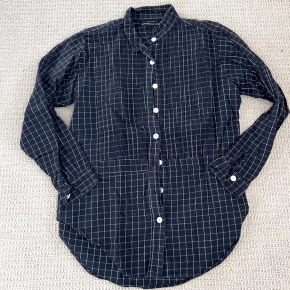 Heavy flannel button down from Carmel Valley boutique Tancredi and Morgen. Navy and white window pane print with tuxedo pleats. Excellent quality. No size tag, but fits like a medium/large. Excellent used condition.