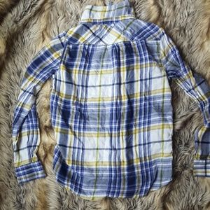 Purple, yellow and lime green plaid on a 100% cotton flannel shirt. Sleeves are rollable.