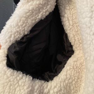 The inside is fuzzy material, the sleeves on the insides are a puffer coat material.