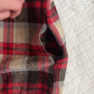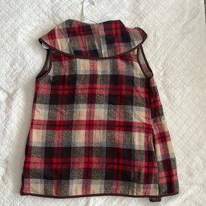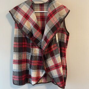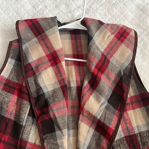 All items will be shipped within 48 hours. It is an Amazon brand, soft brown, red, cream and gray sleeveless flannel. It is very soft and has two pockets. Never worn. (One size fits all-it does not button or zip in the front.) Feel free to message me if you have any questions.