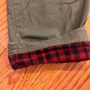 Red and black flannel lined, olive green pants with zipper pockets. Back pockets have button closures. Super warm, great for a late fall/winter hike!