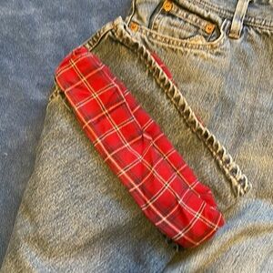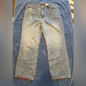 Eddie Bauer jeans, medium blue with red flannel lining to keep you warm in the winter. Relaxed fit and straight leg