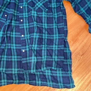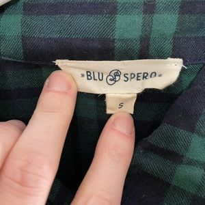 Blu Spero flannel shirt with slits up side and gold buttons. Can fold up and wear as 3/4 sleeve as well. Size small. Navy blue and dark green plaid