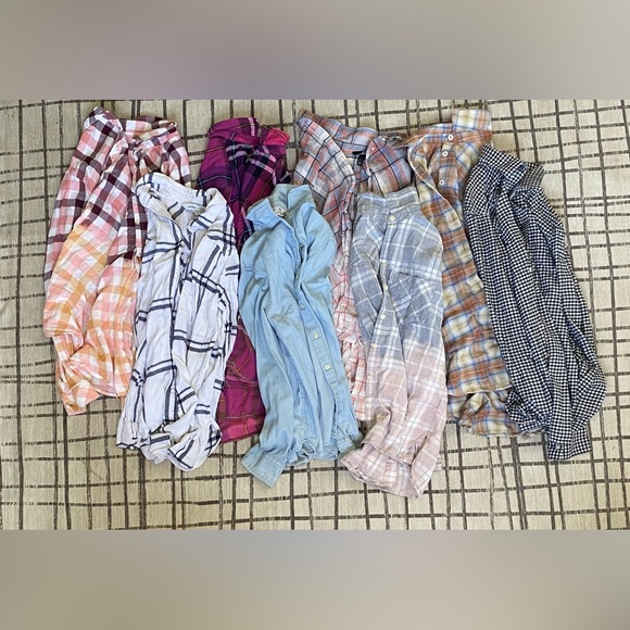 All are different sizes and in good condition if you want to bundle certain ones let me know and I’ll give the price. All details about the flannels is listed on the white sheets of paper! They all are around the same size in how they fit. All in good condition and no tears, or stains!
