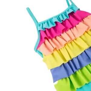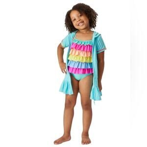 Charming aqua coverup with rainbow ruffle swimsuit. Perfect for beach fun.