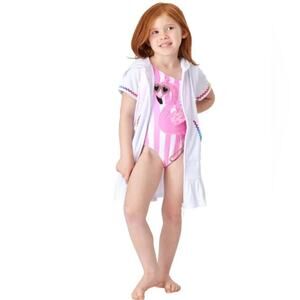 Adorable pink flamingo swimsuit with striped design. Includes a white cover-up with colorful accents.