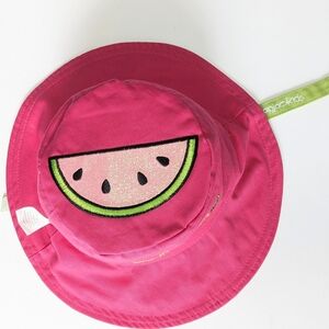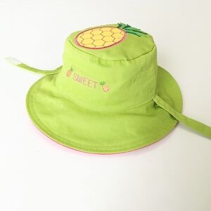 Flapjackkids size medium (2-4yo), lime green and hot pink reversible sun hat with glittery pineapple and watermelon decal on top and stitched slogan on front. Reversible velcro chin strap to keep the hat in place. 100% Cotton(w/exclusion of decals & stitching). New w/out Tags.