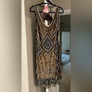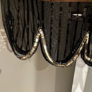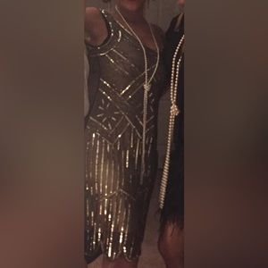 Sequined dress, head band and gloves. Size medium. Worn once for Halloween, but can also make a nice evening outfit if you lose the accessories. Handcrafted by GatsbyLady in London and purchased on Etsy. For reference: I'm a size 6. Dress is lined.