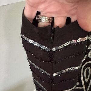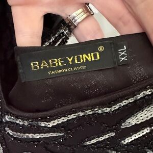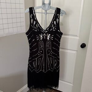 Step out in style with this chic black mini dress, adorned with striking silver accents. Perfect for any Gatsby or Halloween party.