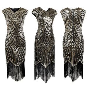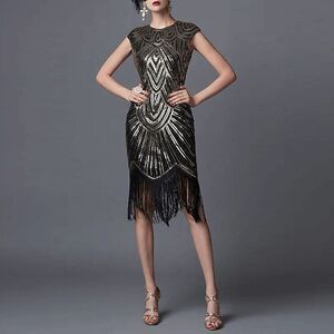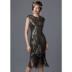 ✨ Flapper Great Gatsby 1920s Retro Tassel Fringe Gold Sequin Dress SIZE XL NEW