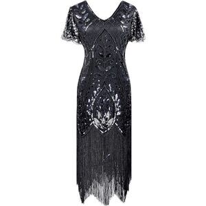 ✨ Flapper Great Gatsby 1920s Retro Tassel Fringe Sequin Midi Black Dress XL NEW