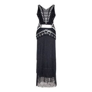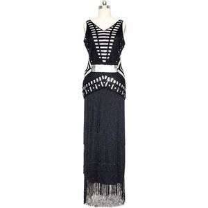 Women's 1920s Flapper Great Gatsby Roaring 20s Vintage Retro Tassel Fringe Sequin Black Silver Dress SIZE M NEW