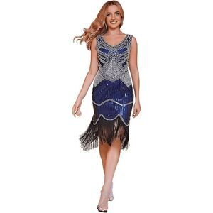 ✨💙 Flapper Great Gatsby 1920s Retro Tassel Fringe Sequin Blue Dress XL NWT