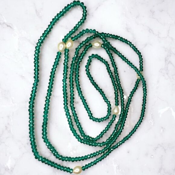 Flapper Length 56” Emerald Green Genuine Faceted Beads Necklace Genuine Pearls