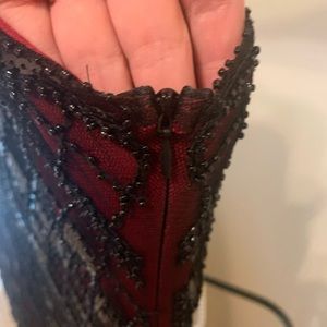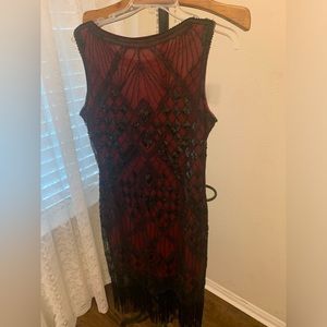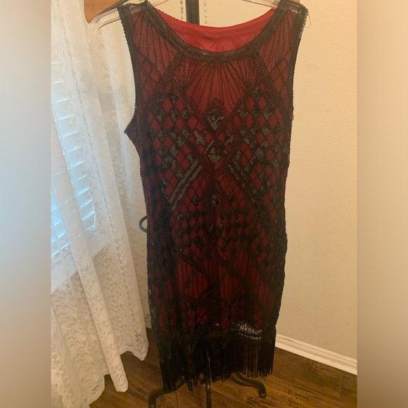 Size large 1920s style flapper dress. Red/ maroonish with black beaded overlay. Has black fringe at the bottom and a zipper on the side. Worn once.
