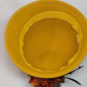 Never worn, new yellow felt hat. 1920's inspired. Black ribbon and decorated with flowers and feathers. One size fits all (about 8-inch across at inside opening where yellow ribbon is)