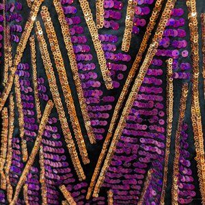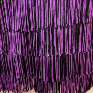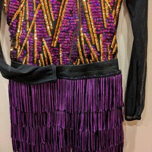 With its sequins and purple fringe this makes for a fun dance costume. The sleeves are sheer sparkly material. It has button snaps on the back of the neck. There are shorts, attached under the skirt. No clear size so I put pictures with a measuring tape for size reference.