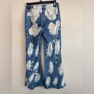 These jeans showcase a striking tie-dye pattern with a blend of deep blue and bright white hues. The flared silhouette adds a touch of retro style, making them a standout piece in any wardrobe. The artistic bleaching technique ensures each pair is uniquely bold and eye-catching.