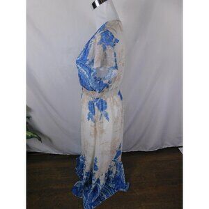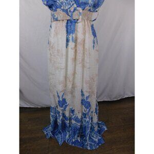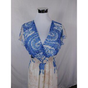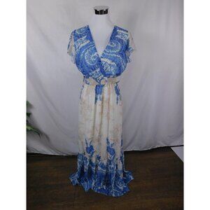 Flare Maxi Dress Womens Blue White Floral Belted Wrap V-Neck Made in Italy