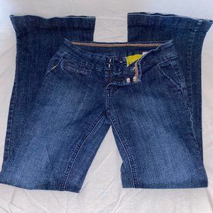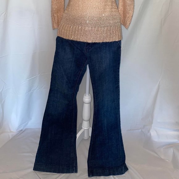 Dark denim jeans, with flare bottom. Inner button with two hook and bar closures. 98% cotton, 2% spandex. Excellent condition.