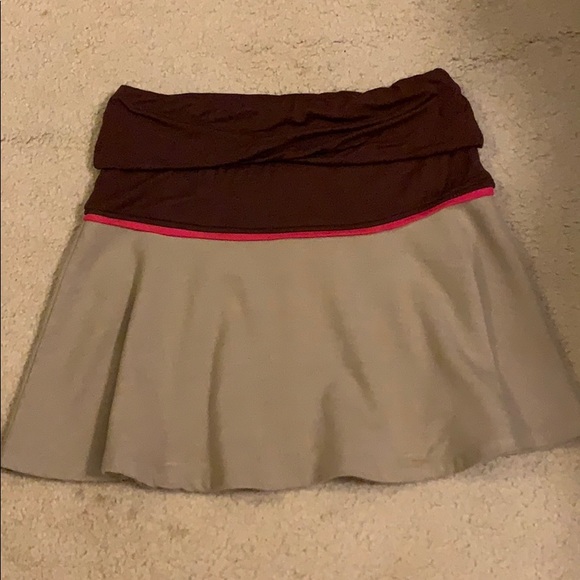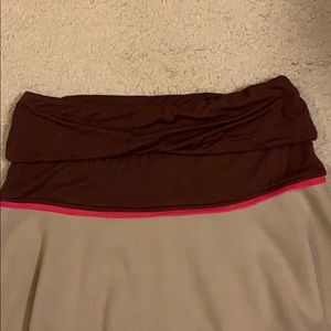 Dark brown rouch top of skirt with hot pink trim. Tan skirt