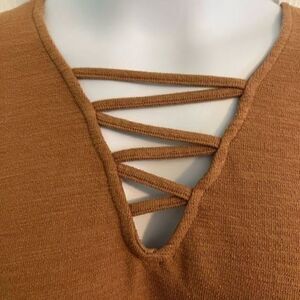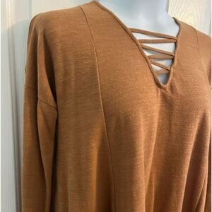 Warm and comfortable Flare Fit Tunic shirt. Gorgeous Mustard/camel color. Cris cross detail on neckline. Size Small but please check measurements as this is a flare bottom Tunic.