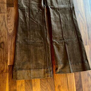 Pants in cotton corduroy with creases at front and back. High waist, zip fly with button, and patch pockets at front and back. Flared legs.