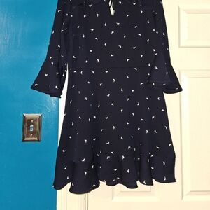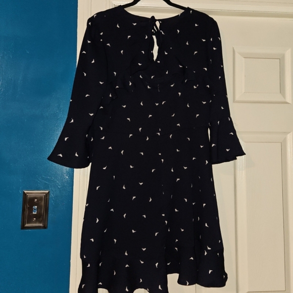 Navy Blue Flare dress with slightly flared arms. Zipper is in the back of the dress, but also a nice tie finish as the top.